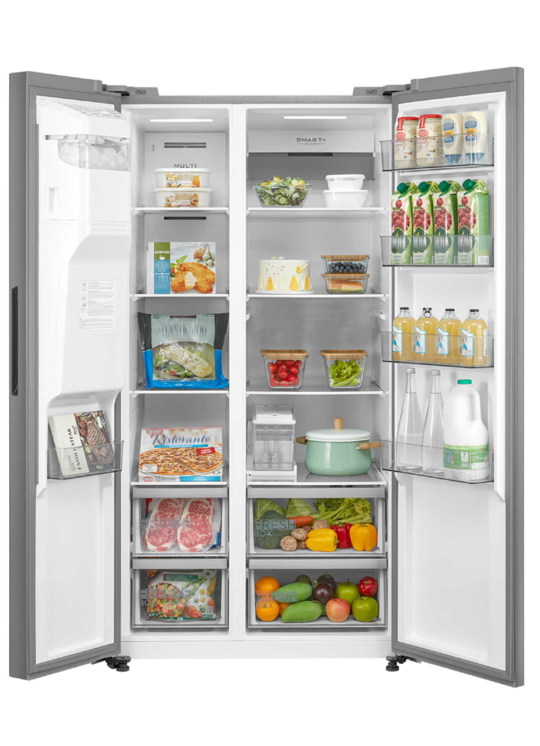 Keep your kitchen stylish and your food perfectly fresh with the Midea American Style Fridge Freezer. Its sleek inox design and generous 573L capacity make it ideal for families, while No Frost dual cooling ensures even temperature and prevents ice build-up. Enjoy the convenience of chilled water, ice cubes, or crushed ice anytime with the built-in dispenser, and stay in control from anywhere using Midea’s SmartHome app. Designed for modern living, it combines energy-efficient performance, quiet operation, and thoughtful features like super cooling, super freeze, and humidity-controlled crispers to make your daily routine easier and more enjoyable.